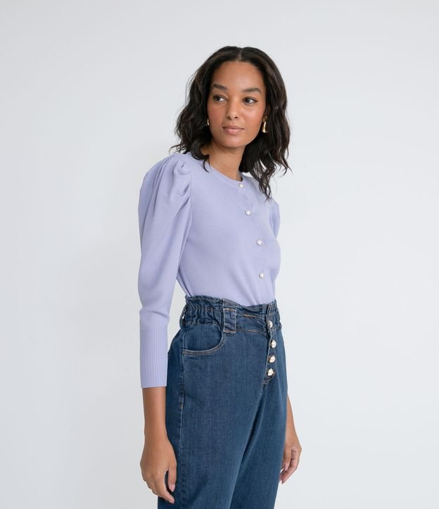 Cardigan Curto em Tricô com Mangas Bufantes e Botões de Pérola