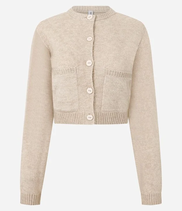 Cardigan Curto em Tricô com Textura Atoalhada Bege