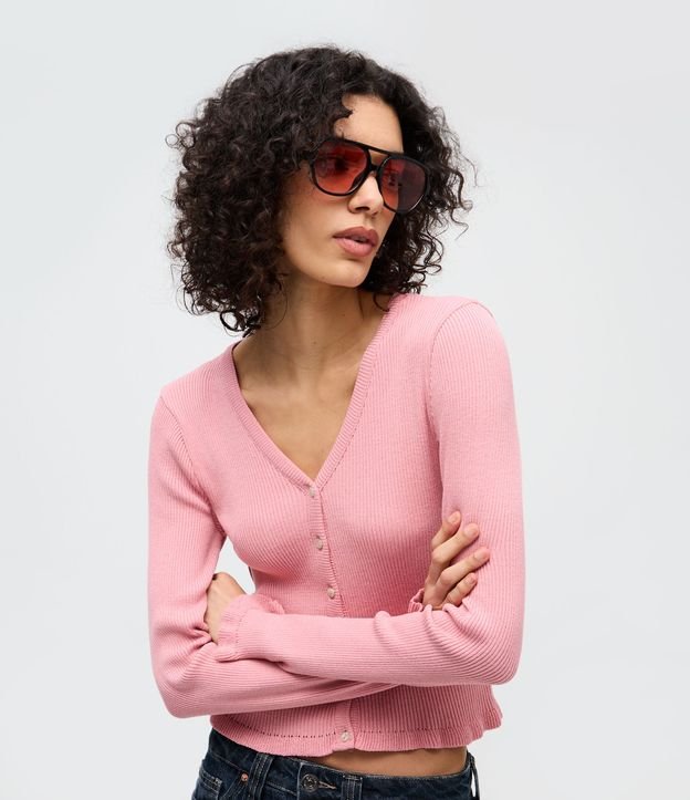 • Cardigan em Tricô com Ponto Texturizado e Babados na Barra Rosa 1