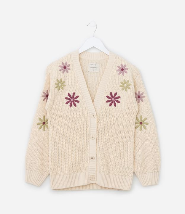 Cardigan Infantil em Tricô com Bordado Floral - Tam 5 a 14 Anos Bege