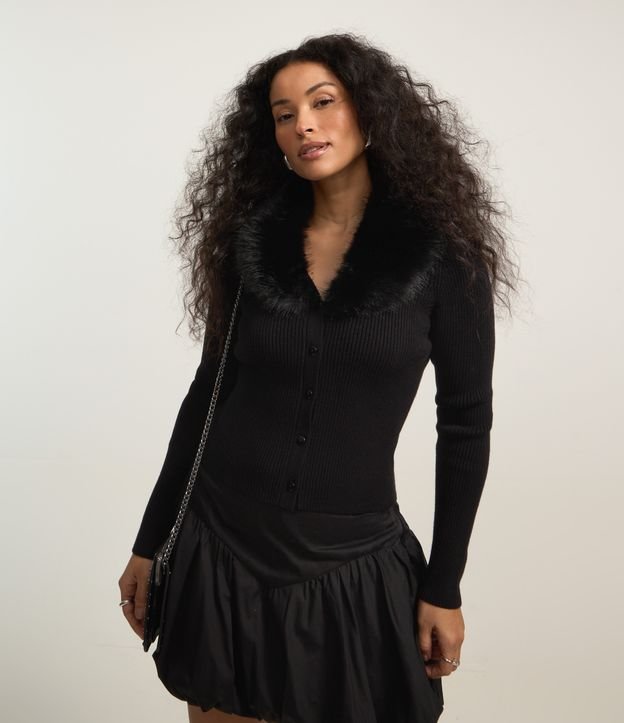 Cardigan Regular em Tricô com Gola de Pelo Removível Preto