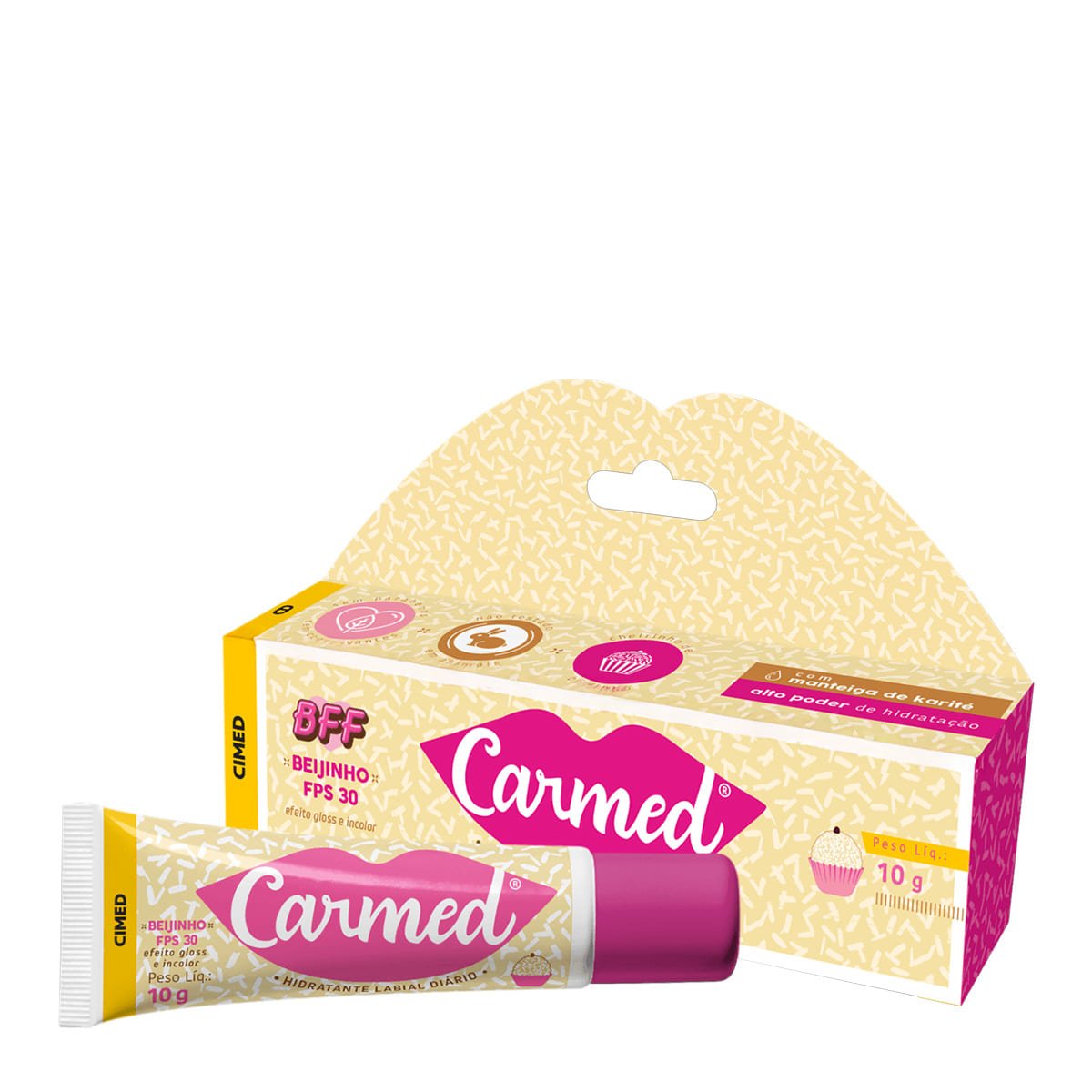 Carmed BFF Beijinho FPS 30 - Hidratante Labial 10g O aliado ideal para labios hidratados e protegidos! Com fps 30, proporciona cuidado e protecao contra os raios UVA e UVB. Enriquecido com manteiga de cacau, restaura e previne os labios contra ressecamentos e rachaduras labiais. Com aroma de beijinho, garante labios saudaveis mesmo sob a exposicao ao sol. Conselho de AplicacaoAplicar sempre que necessario para manter os labios macios e hidratados.