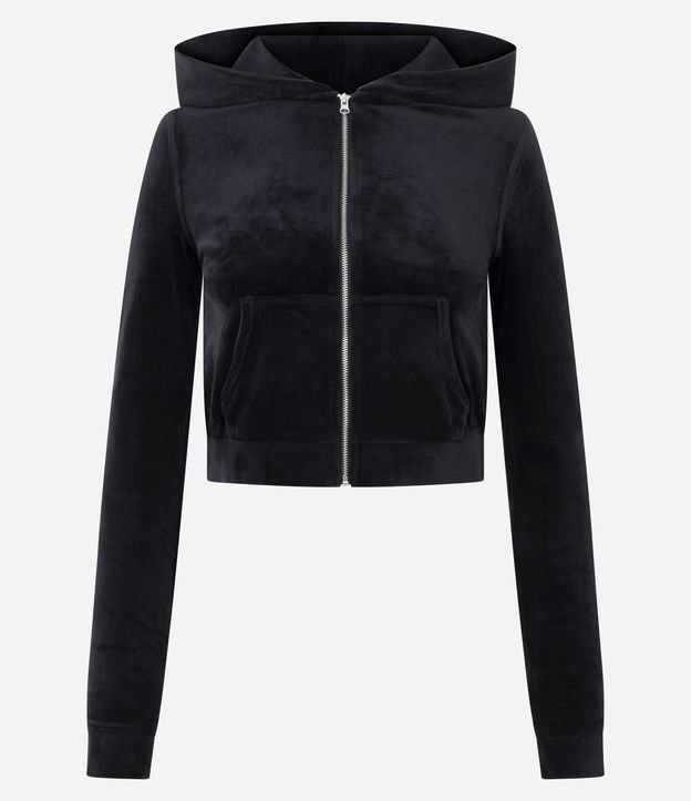 Casaco aberto feminino confeccionado em plush. Possui gola com capuz, manga longa, fechamento por zíper e bolsos.