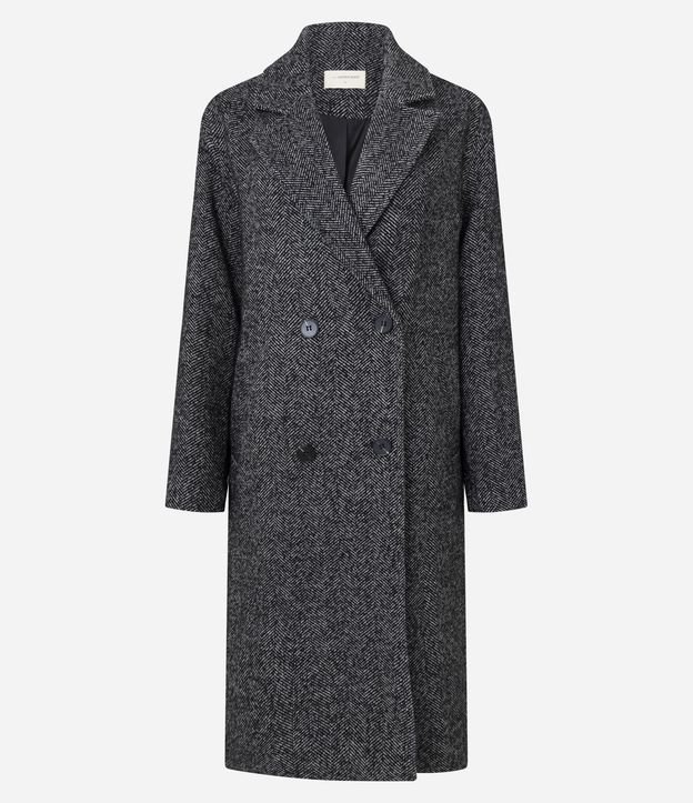 Casaco feminino alongado com padronagem espinha de peixe. Possui lapelas amplas, fechamento com botões, mangas retas e o caimento estruturado reforçam o visual elegante.