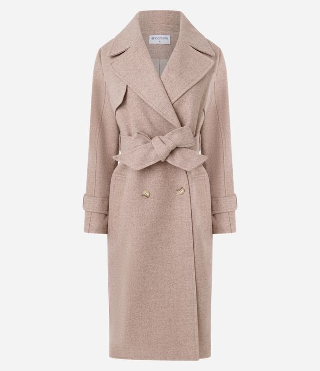 Casaco pesado feminino confeccionado com viscose mais sustentável. Possui comprimento longo, modelagem transpassada com fechamento por botões, lapela ampla, faixa do mesmo material para amarração na cintura, mangas longas e fenda traseira.