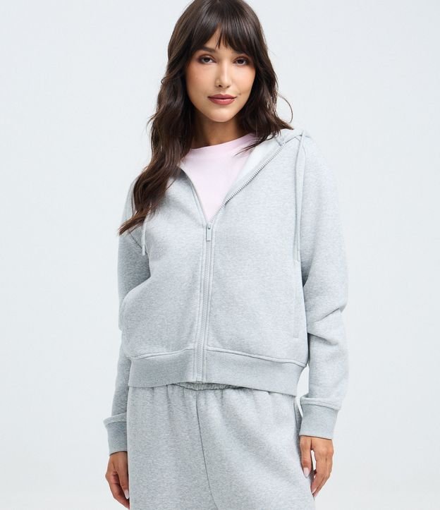 Casaco em Moletom com Capuz e Zíper Frontal Cinza