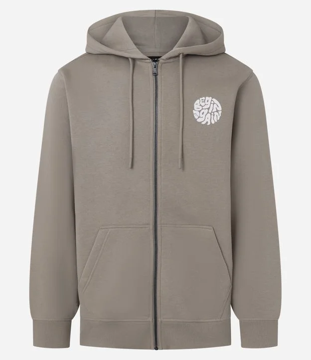 Casaco masculino de moletom com capuz, mangas longas e fechamento por zíper. Possui estampa lettering circular no peito e bolsos frontais. Produzido com algodão certificado BCI e boas práticas ambientais.