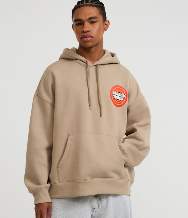 Casaco em Moletom Felpudo com Estampa Piu Piu Monstro e Bolso Canguru Bege