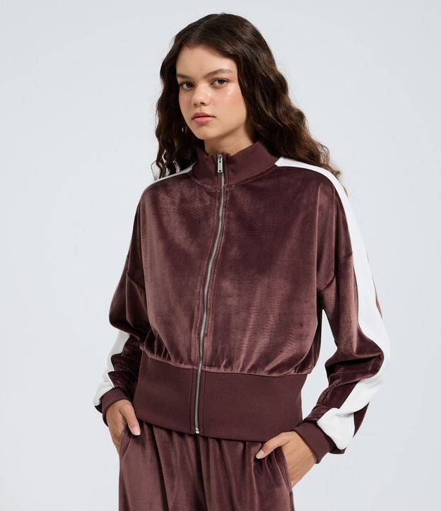 Casaco em Plush com Gola Alta e Listra Lateral Marrom