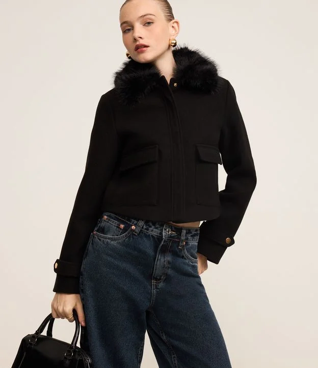 Casaco confeccionado em polivelour com lapela na gola, fechamento frontal com vista oculta além de bolsos cargos frontais e lapelas nos punhos com botões. Possui comprimento mais curto além de pelinhos aplicados na lapela da gola.