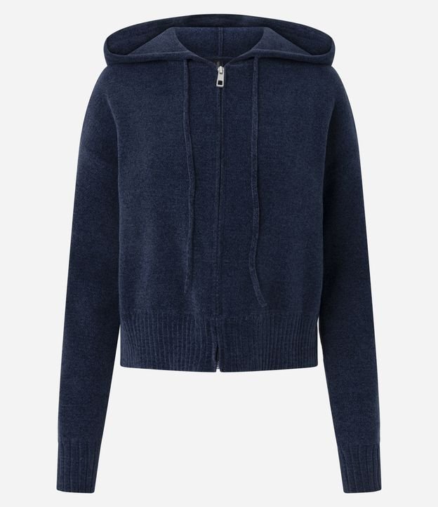 Casaco em Tricô Chenille com Capuz e Zíper Azul