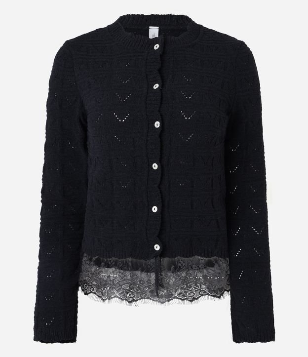 Casaco Feminino Tricô Leve Ponto Aberto com Renda Preto