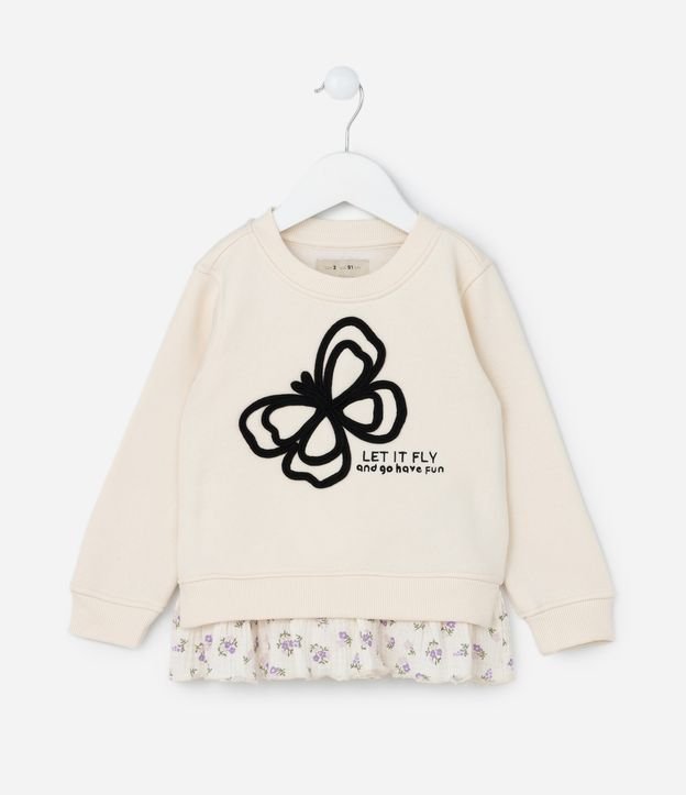 Casaco infantil confeccionado em moletom quentinho, de material mais sustentável. Possui gola redonda, mangas longas, com bordado no peito de borboletinha e barra diferenciada com estampa floral delicada!