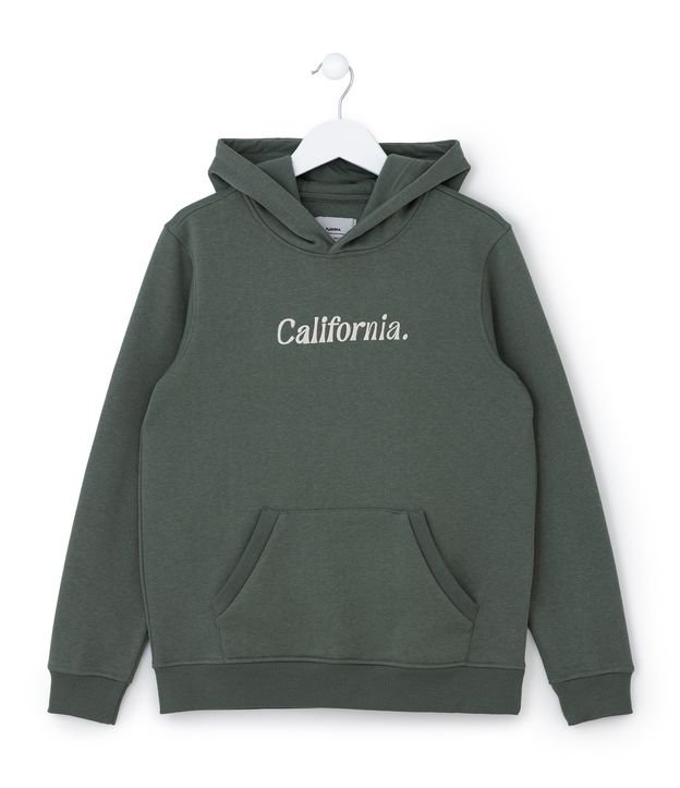 Casaco infantil de modelo fechado, confeccionado em moletom com forro quentinho, gola com capuz, mangas longas, bolso canguru e bordado California.