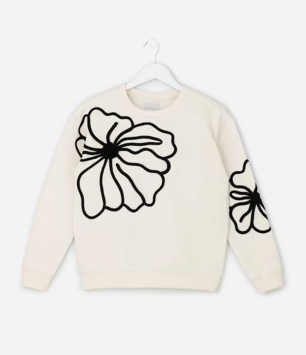 Casaco infantil modelo regular confeccionado em moletom com felpa, garantindo conforto e aquecimento. Possui gola redonda, mangas longas e acabamento canelado na barra e punhos. Traz bordado floral em corda com desenho em destaque, deixando o visual moderno.