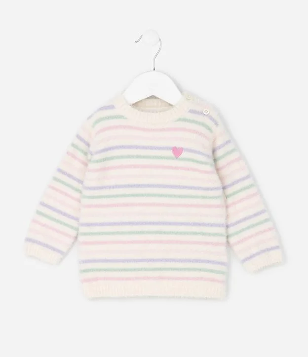 Casaco Infantil em Chenille com Listras e Coração Bordado – Tam 0 a 18 Meses Off White