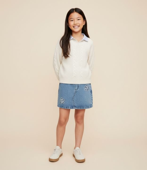 • Casaco Infantil em Efeito Tricô com Gola Listrada – Tam 5 a 14 Anos Off White 1