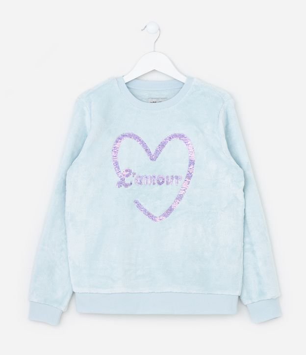 Casaco infantil confeccionado em fleece quentinho, com gola redonda, magas longas e bordado em paetês no formato de coração com lettering "L'amour".