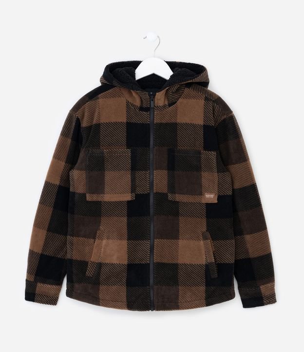 Casaco Infantil em Fleece com Estampa Xadrez e Capuz – Tam 5 a 14 Anos Marrom