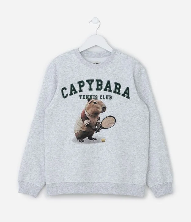 Casaco Infantil em Moletom com Estampa Capivara Tenista - Tam 5 a 14 Anos Cinza