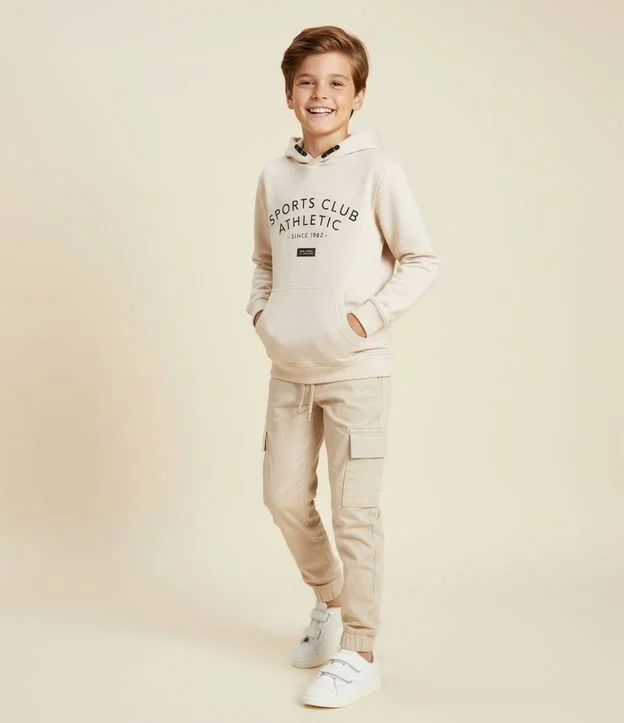 Casaco Infantil em Tech Fleece com Capuz e Bolso Canguru – Tam 5 a 14 Anos Bege Claro