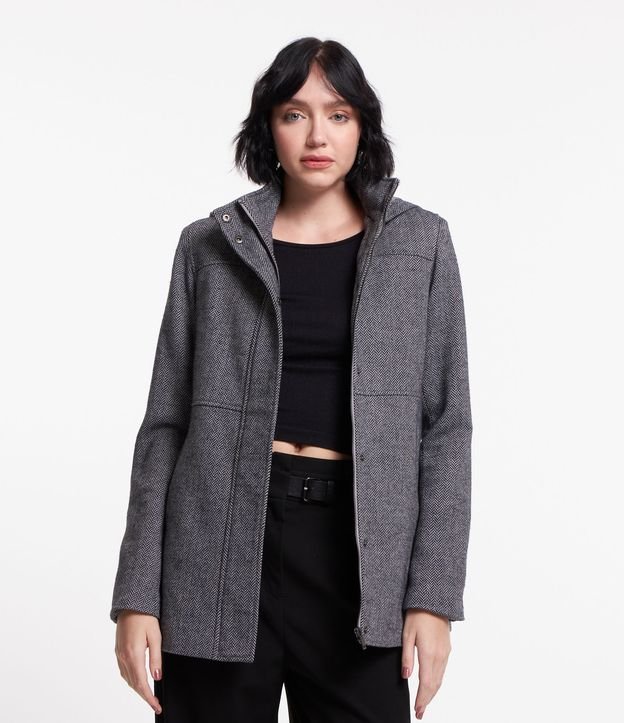 Casaco Longo em Polivelour com Capuz e Textura Espinha de Peixe