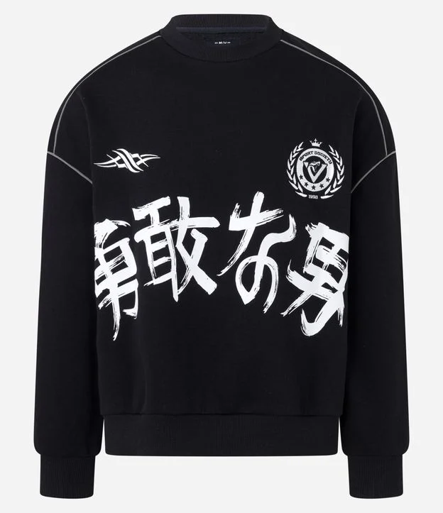 Casaco Moletom com Felpa Estampa Lettering Japonês e Bordado Preto