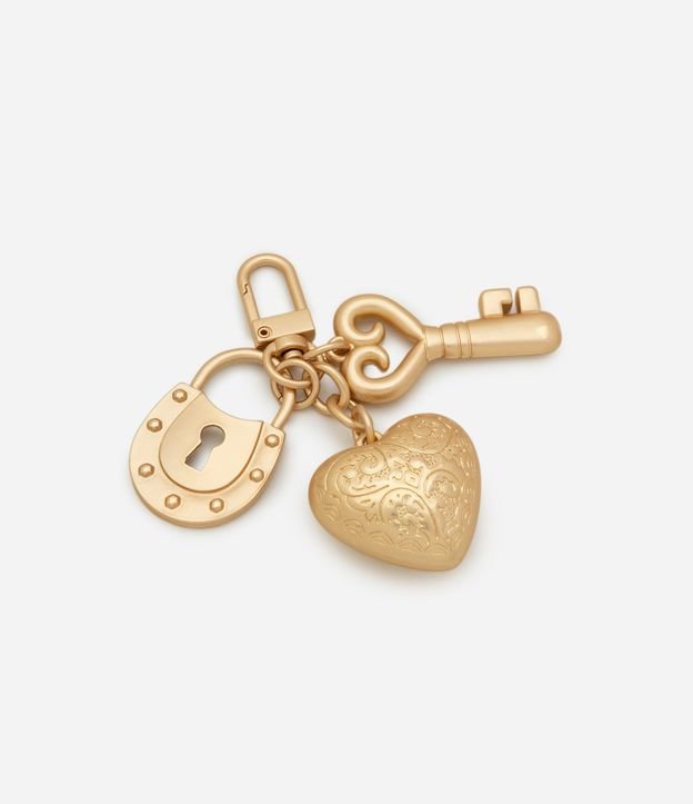 Chaveiro em metal fosco composto por três pingentes: um coração com relevo, uma chave alongada e um cadeado vazado. As peças são presas por argolas metálicas a um mosquetão simples, ideal para encaixe em bolsas ou chaveiros.