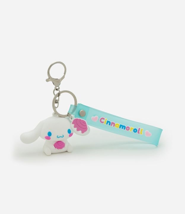 Chaveiro infantil produzido em plástico resistente com elo metálico, trazendo miniatura do personagem Cinnamoroll, da Sanrio, conhecido por seu visual fofo e orelhas compridas. Possui pingente adicional e alça emborrachada estampada, facilitando o uso em mochilas, bolsas ou estojos.