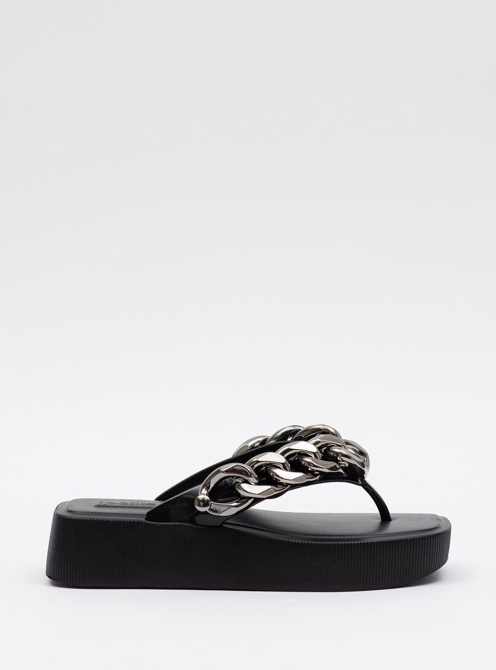 Chinelo de dedo na cor preto com solado flatform de EVA e bico quadrado. Possui aplicação de correntes metalizadas, com tiras grossas em J-Lastic, que separam os dedos. Palmilha da mesma cor com o nome da marca e solado flatform. Deixa dedos, laterais e calcanhar à mostra.