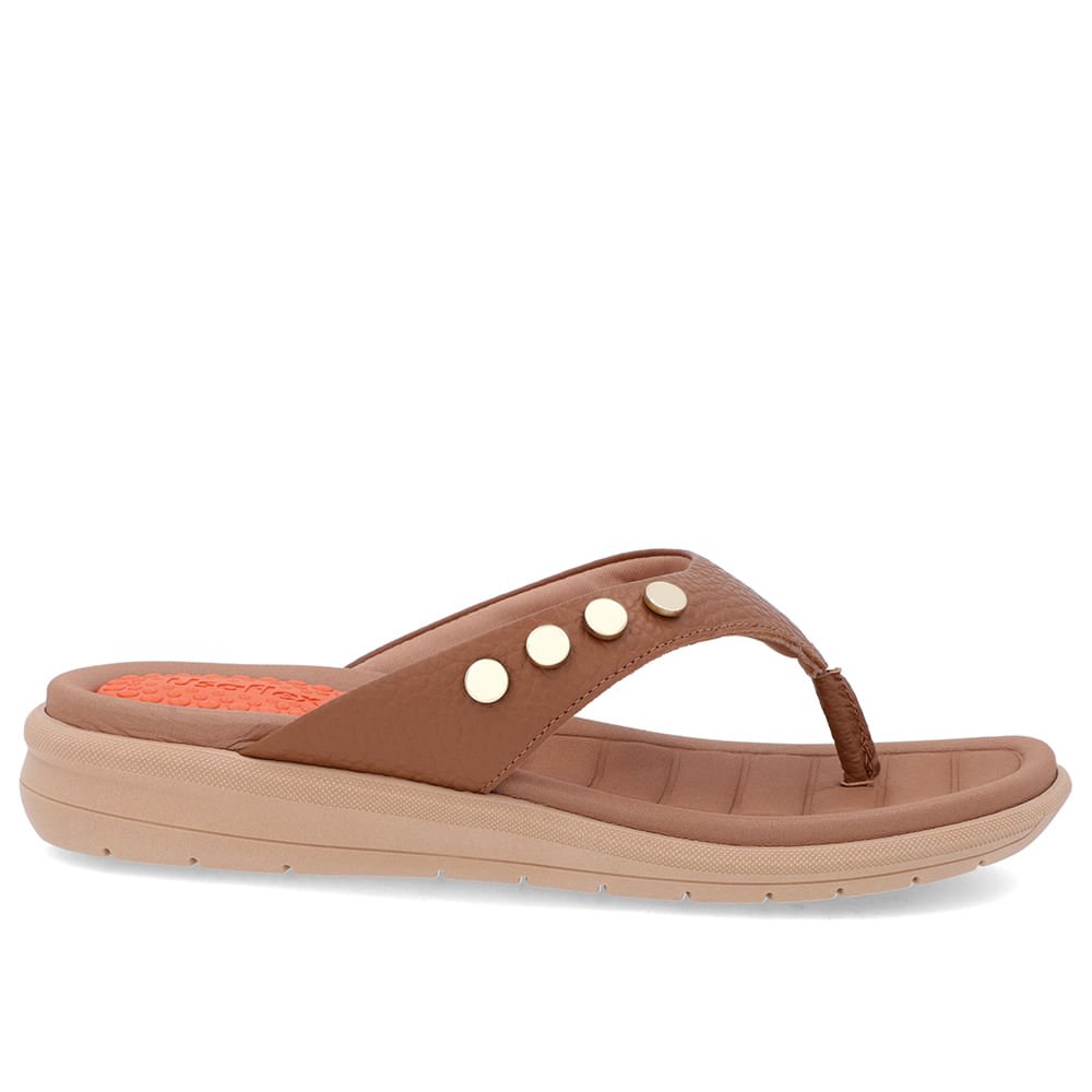 Chinelo cabedal em couro relax catalano na cor caramelo. O modelo possui tecnologia Amortecedor, com uma gota de borracha em sua palmilha para amortecer o impacto da pisada.