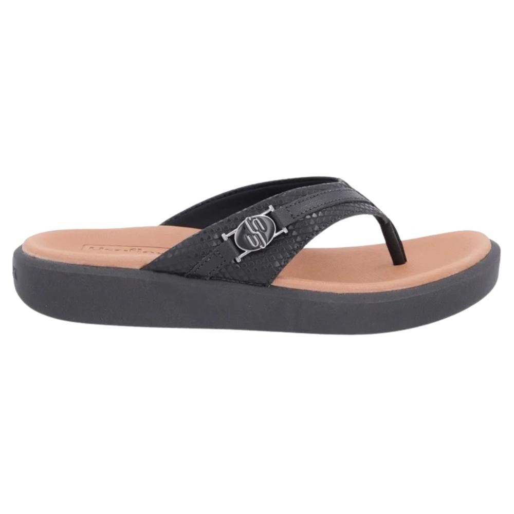 Chinelo plataforma cabedal em couro napa valise e escama na cor preta detalhe enfeite. O modelo possui tecnologia Sola+Conforto, um solado com altura entre 2 e 4cm de salto que distribui o peso corporal na pisada.||