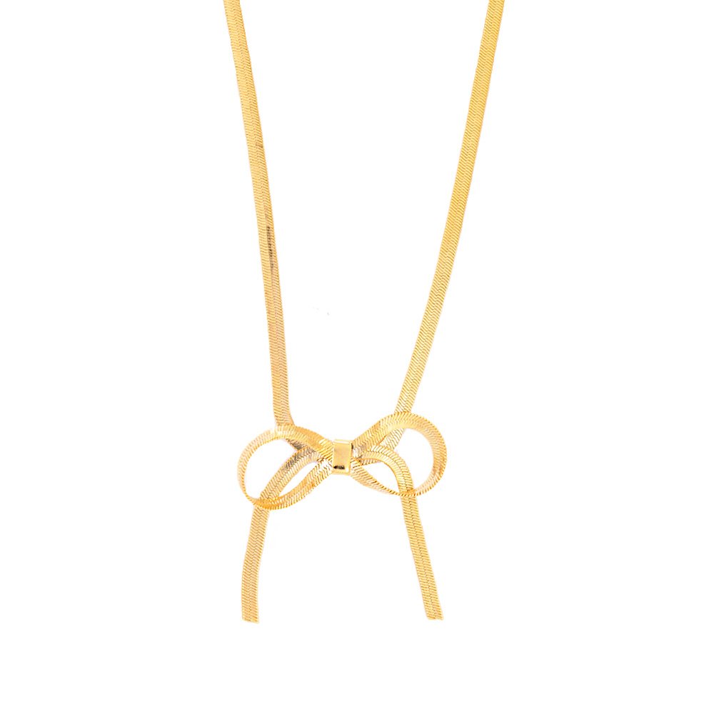 E uma semijoia com banho de ouro 18k, choker malha laco e uma peca bem charmosa e versatil, perfeita para adicionar um toque delicado e romantico ao look. Esse estilo de choker combina tanto com roupas casuais quanto com producoes mais elegantes.Um choker de malha com laco fica lindo com blusas de decote em V ou ombro a ombro, valorizando o pescoco e o colo.Esse choker tem um ar leve e delicado, por isso ele combina muito bem com tecidos fluidos como seda, cetim ou algodao, especialmente em tons neutros ou pastel. Peso: 6 gr Comprimento: 28,5 cm Extensor: 10 cm Largura malha: 0,5 mm Largura laco: 4 cm Comprimento laco: 4,5 cm Material: Banho de ouro 18k