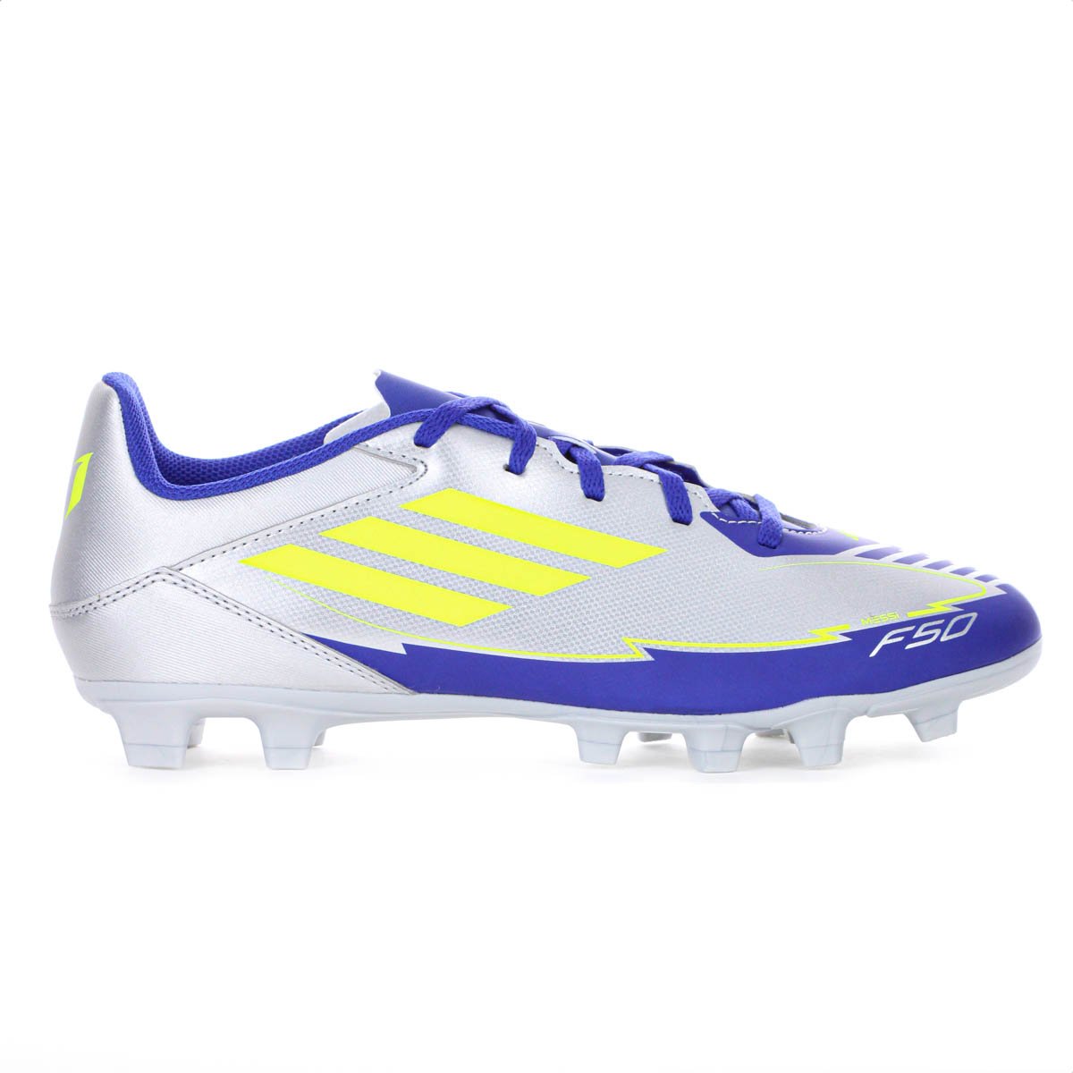 Conteudo da embalagem: 1 par de Chuteira Adidas Campo F50 Club FG/MG Messi Prata Verde e Azul - Masculino