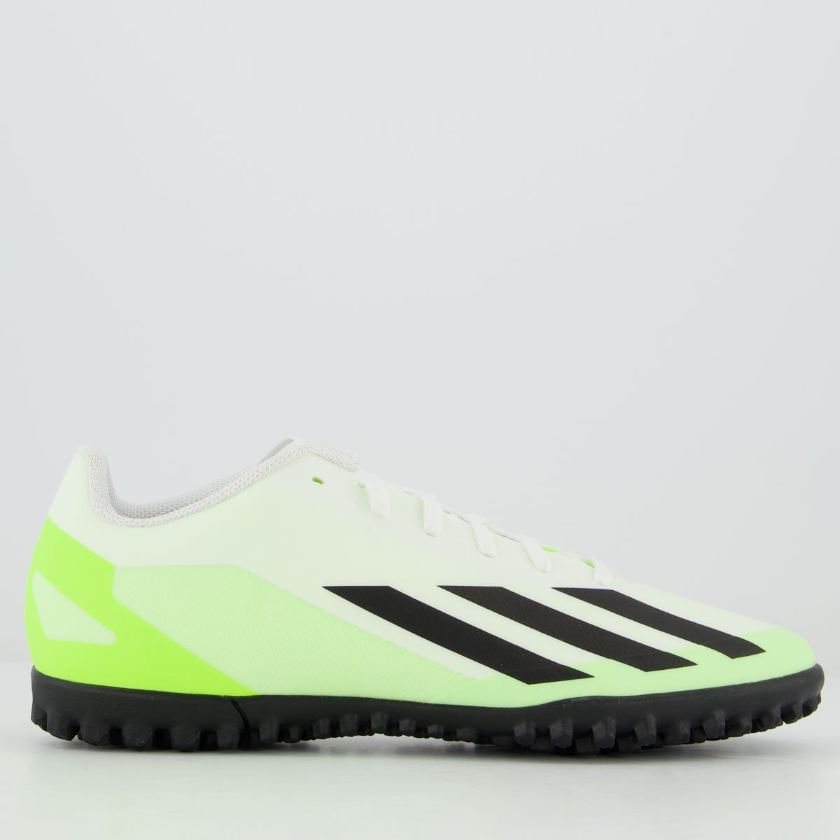 Chuteira Adidas X Crazyfast 23.4 TF Society Branca e Amarelo Fluorescente