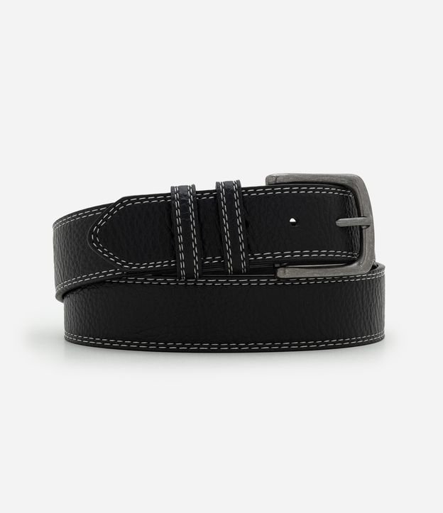 Cinto masculino confeccionado em material sintético, com tira média. Peça com fivela quadrada e pesponto contrastante ideal para completar seu guarda roupa.