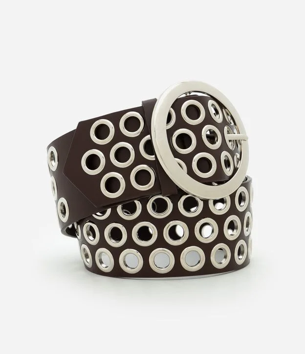 Cinto Largo em PU com Ilhoses e Fivela Redonda Marrom