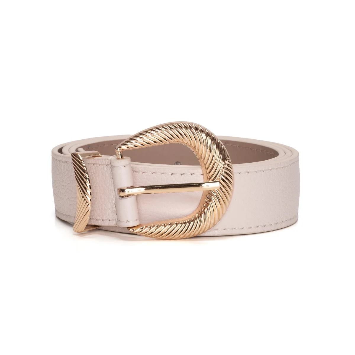 - Fivela dourada com detalhes texturizados que destacam o design