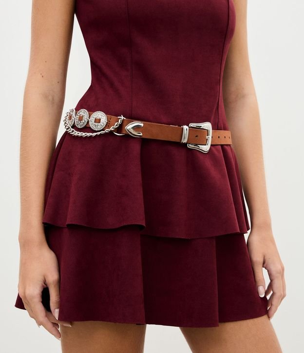 Cinto Médio em PU Com Detalhe de Corrente e Fivela Western Marrom