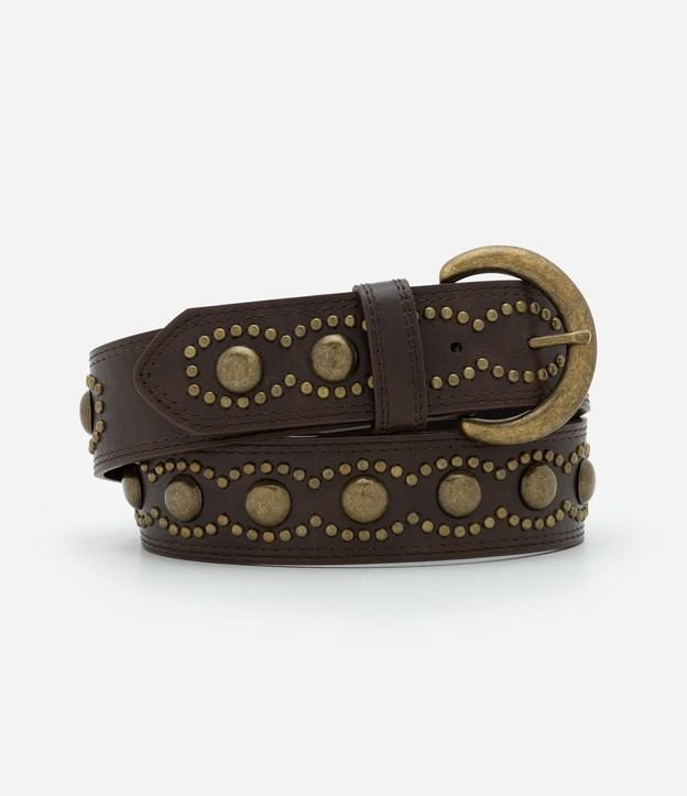 Cinto médio feminino em PU com fivela arredondada em banho ouro envelhecido. Possui aplicações metálicas decorativas ao longo da faixa e passante reforçado. O ajuste é feito por furos tradicionais, garantindo firmeza e acabamento estruturado na cintura.