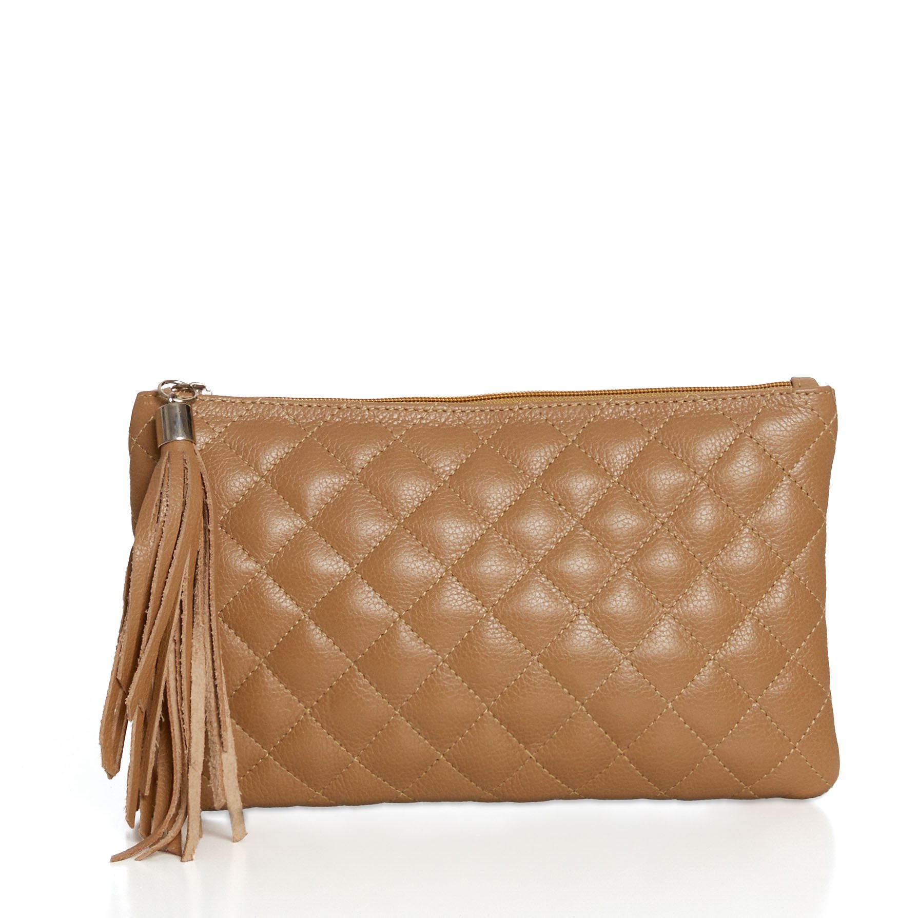 Essa clutch em couro matelassê é uma peça elegante e prática! O fechamento por zíper garante segurança para seus pertences. O detalhe do chaveiro tassel adiciona um toque de charme e sofisticação. É perfeita para complementar diversos looks, seja em ocasiões especiais ou no dia a dia.