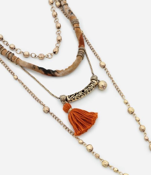 Colar camadas com correntes diversas, pingentes, esferas e tassel.