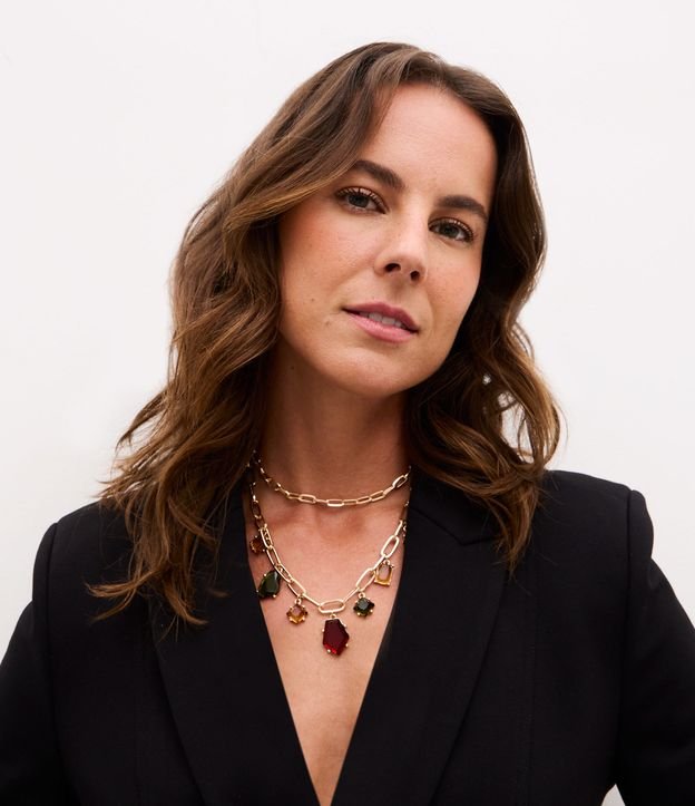 Colar feminino em camadas composto por duas correntes de elos metálicos. A camada principal traz pingentes geométricos em pedras e fecho alongado que permite ajuste de comprimento.