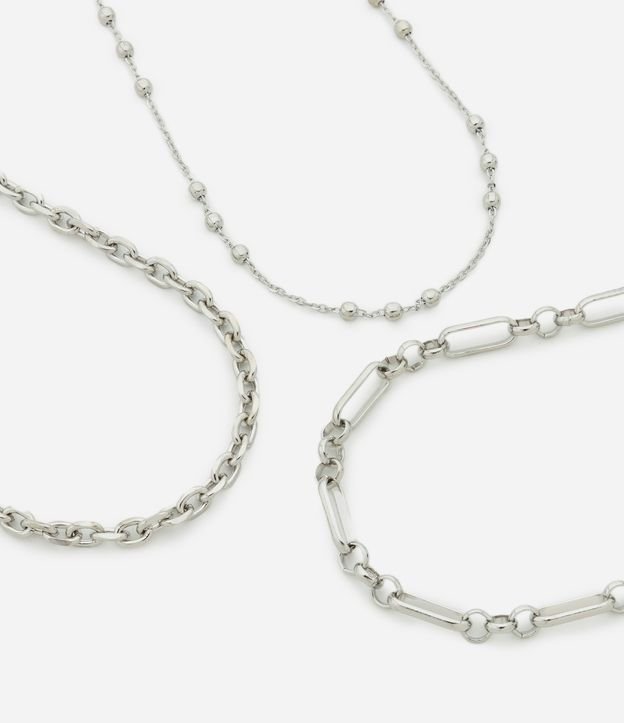 Colar feminino em camadas feito em metal reciclado, unindo estilo e sustentabilidade. O conjunto possui três modelos: elos pequenos, elos longos e corrente com bolinhas, criando combinações modernas e elegantes para valorizar qualquer look.