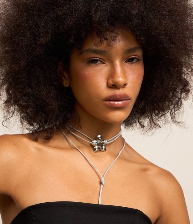 Colar Curto Cordão Fio com Pingente de Flor em Strass