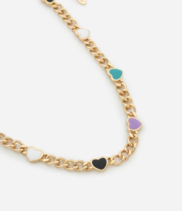 Colar curto feminino confeccionado em metal reciclado, peça com corrente de elos finos longos, entremeios de corações coloridos esmaltados.