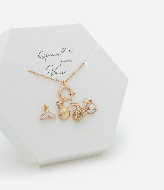 Colar curto com suporte para troca de pingentes, acompanha 04 variedades de pingentes fundo do mar, sendo calda de sereia com madrepérola, uma concha fechada, uma concha aberta com madrepérola e perola artificial, uma concha com estrelinha do mar. Produto com banho folhado.
