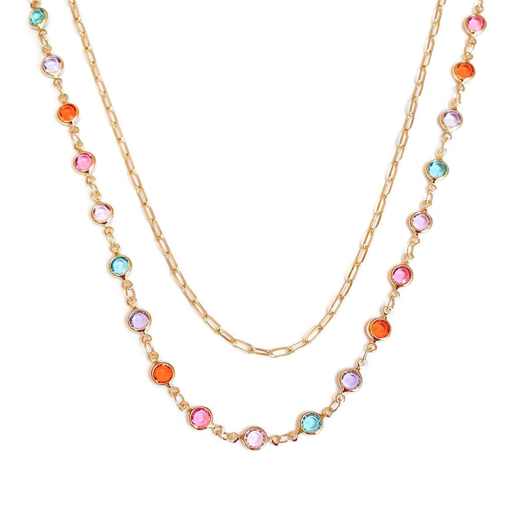 Colar Duplo Corrente Elos e Cristais Coloridos Semijoia