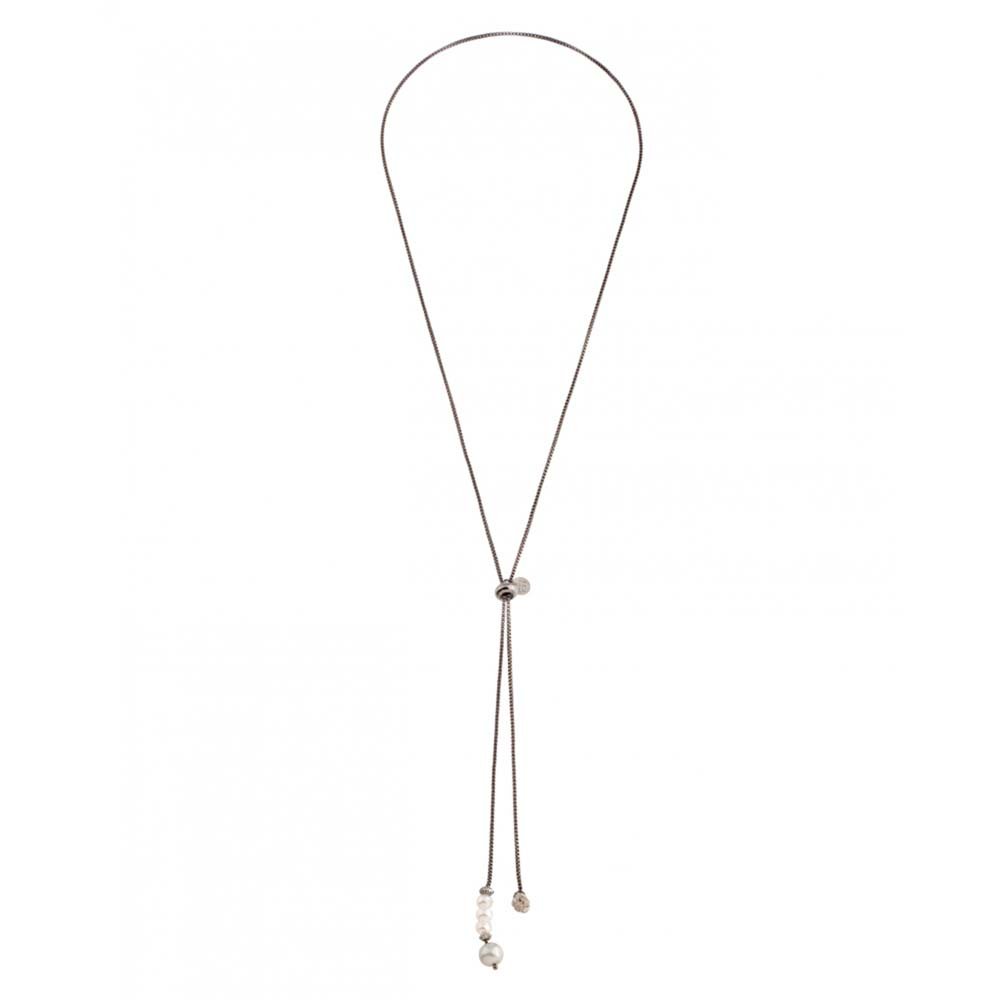 Colar Feminino Gravatinha Nó Prateado Harmony inteiramente composto por corrente no estilo veneziana (Grafite), com sistema de fechamento ajustável, no modelo gravatinha. Possui em sua extremidade um lindo nó prateado de um lado; e (3) três mini pérolas, entremeios de metal trabalhados, contém (1) uma pérola cintilante do outro, além de plaquinha FH personalizada. Acabamentos e metais em banho Grafite em sua composição.