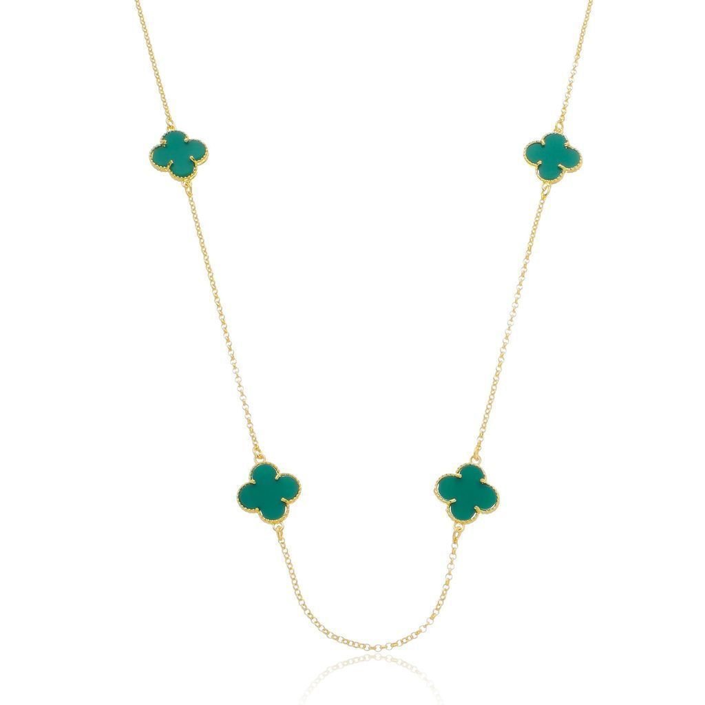 Colar Longo 4 Trevos Resina Verde Semijoia Banho Ouro Verde